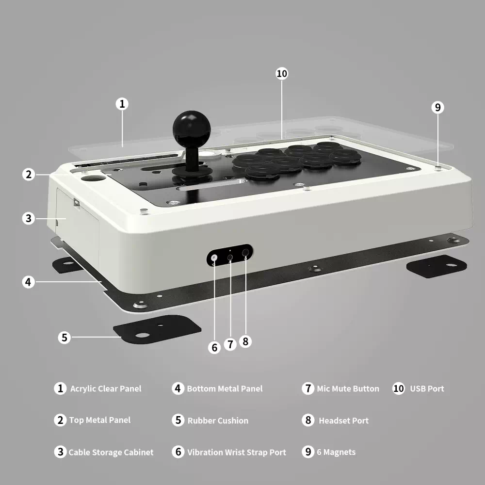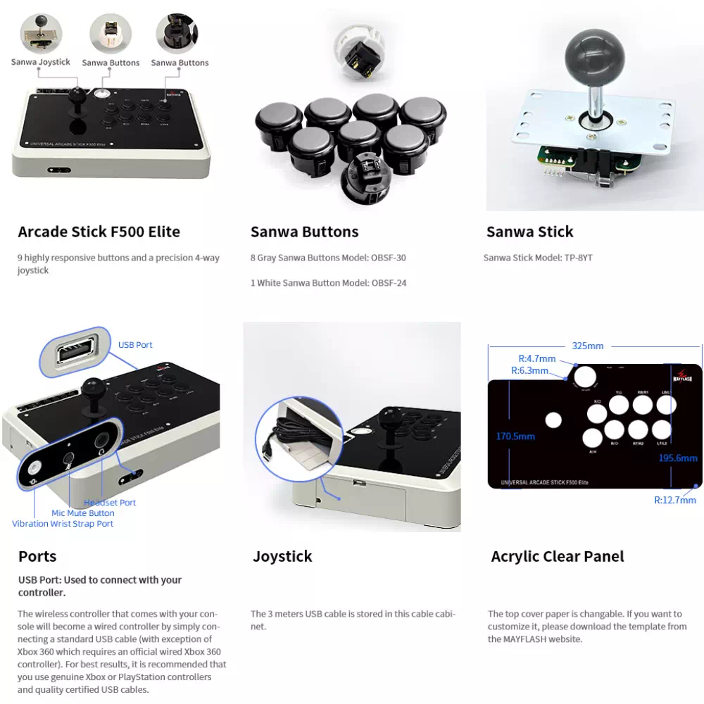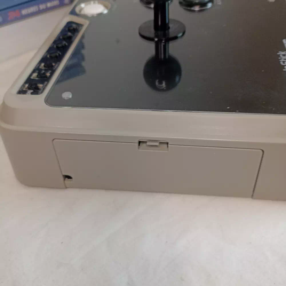 La F500 Elite est équipée de composants Sanwa haut de gamme : 9 boutons et un joystick quadridirectionnel. Elle est dotée de compartiments de rangement internes. Son grand format et son poids (deux panneaux métalliques) la rendent équilibrée et confortable pour une expérience de jeu fluide.