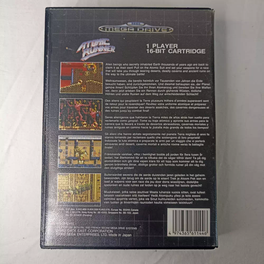 Atomic Runner est un shoot’em up sur Megadrive. Vous contrôlez Chelnov, un scientifique dont la soeur a été enlevée par des extraterrestres nommés Deatharians. Grâce à sa combinaison, Chelnov devient Atomic Runner et bénéficie de super pouvoirs. Dans ce jeu, le héros court en permanence et vous ne contrôlez pas son avancé. Vous utilisez la manette pour sauter et tirer sur les nombreux ennemis qui apparaissent.