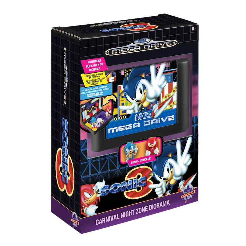 Cette statuette Console Heroes est une reproduction en forme de cartouche de jeu Mega Drive pour Sonic 3, parfaite pour les fans de rétro gaming et de la célèbre série du hérisson. Lorsqu’on l’ouvre, elle dévoile un diorama détaillé de la scène emblématique de Carnival Night zone 2, avec un ballon et un anneau et sur les coté Sonic et Knuckles