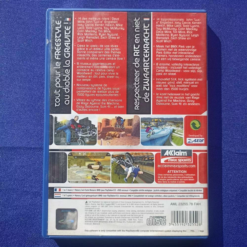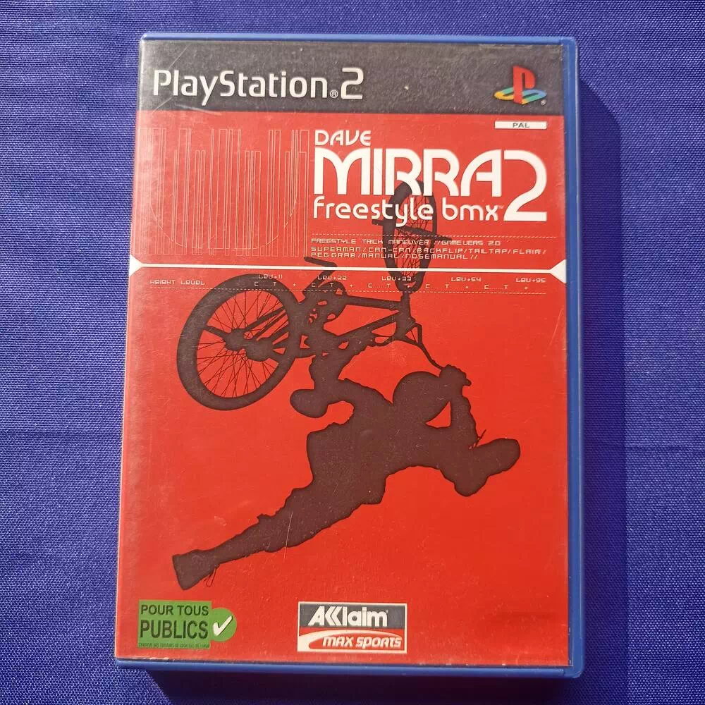 Dave Mirra Freestyle BMX 2 sur Playstation 2 est le deuxième opus de la série de jeux de sport extrême éditée par Acclaim. En tant que jeu classique de Freeride, il vous faut atteindre un certain score en temps limité. Au fur et à mesure de vos enchaînements de combinaisons et de vos figures, vous apprendrez à maîtriser les 1500 tricks que comporte cette version.