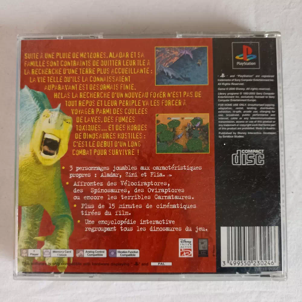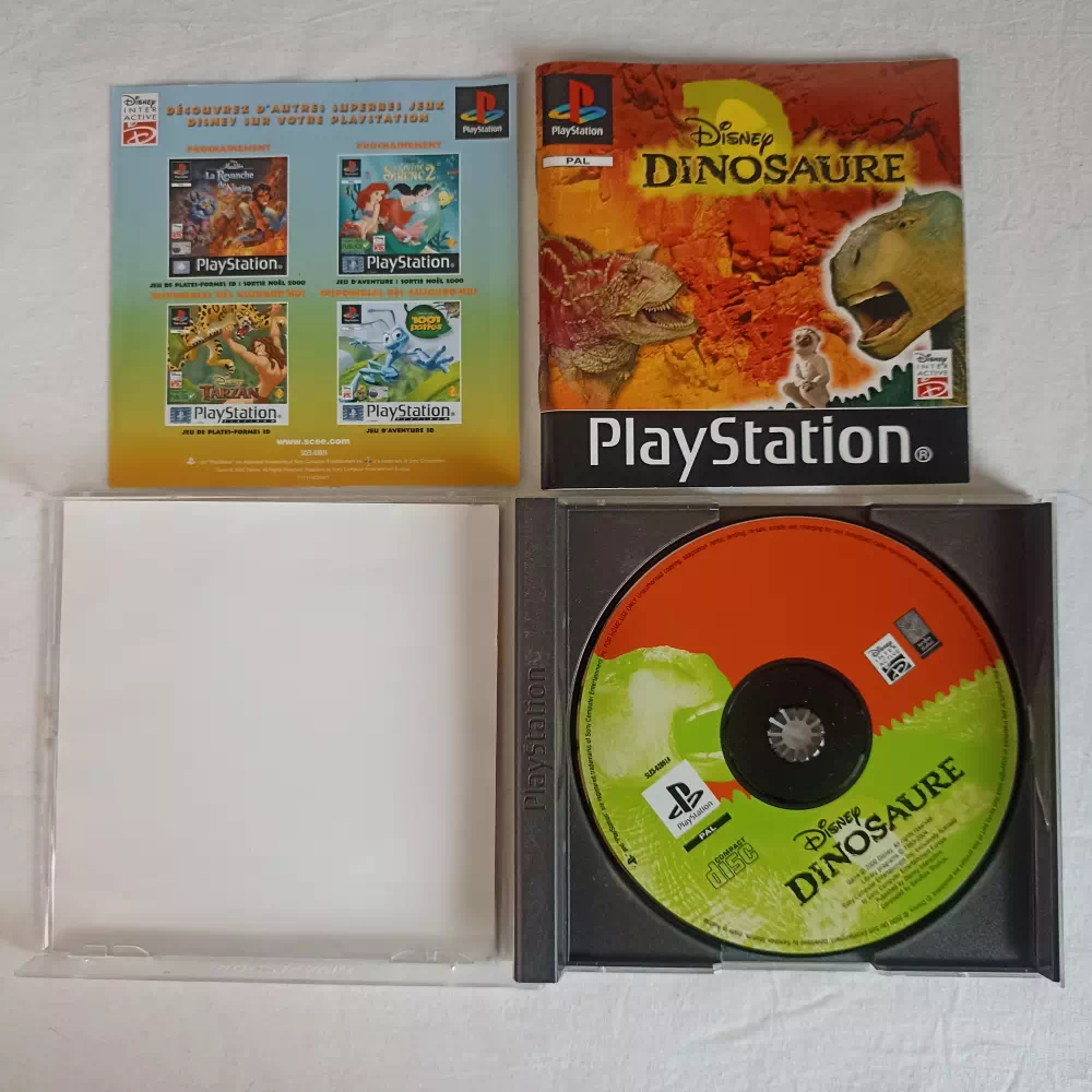 Dinosaure est l’adaptation sur Playstation du film Disney du même nom. Il s’agit essentiellement d’un jeu d’action/réflexion s’adressant aux jeunes joueurs. Vous contrôlez au choix Flia, Aladar ou Zini, chacun disposant de capacités propres. Vous devez les faire évoluer ensemble et s’entraider afin qu’ils atteignent des contrées plus paisibles et sûres.