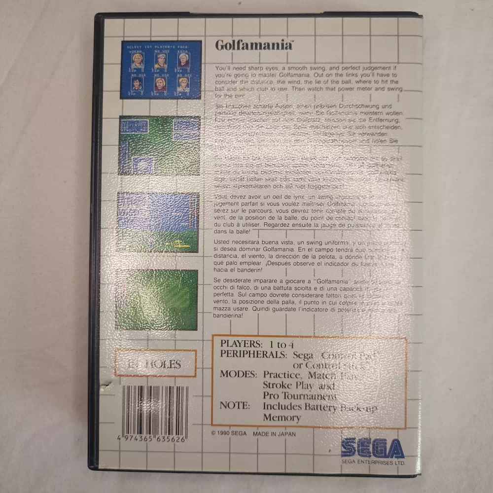 Golfamania est une simulation de golf sur Master System. En solo ou en multijoueur (jusqu’à 4 joueurs en alternance), l’objectif est de finir chaque parcours en un minimum de coups. Vent, qualité du terrain, style de club, distance de l’objectif, de nombreux facteurs doivent être pris en compte pour éviter de vous perdre avec votre petite balle au fin fond de la forêt.