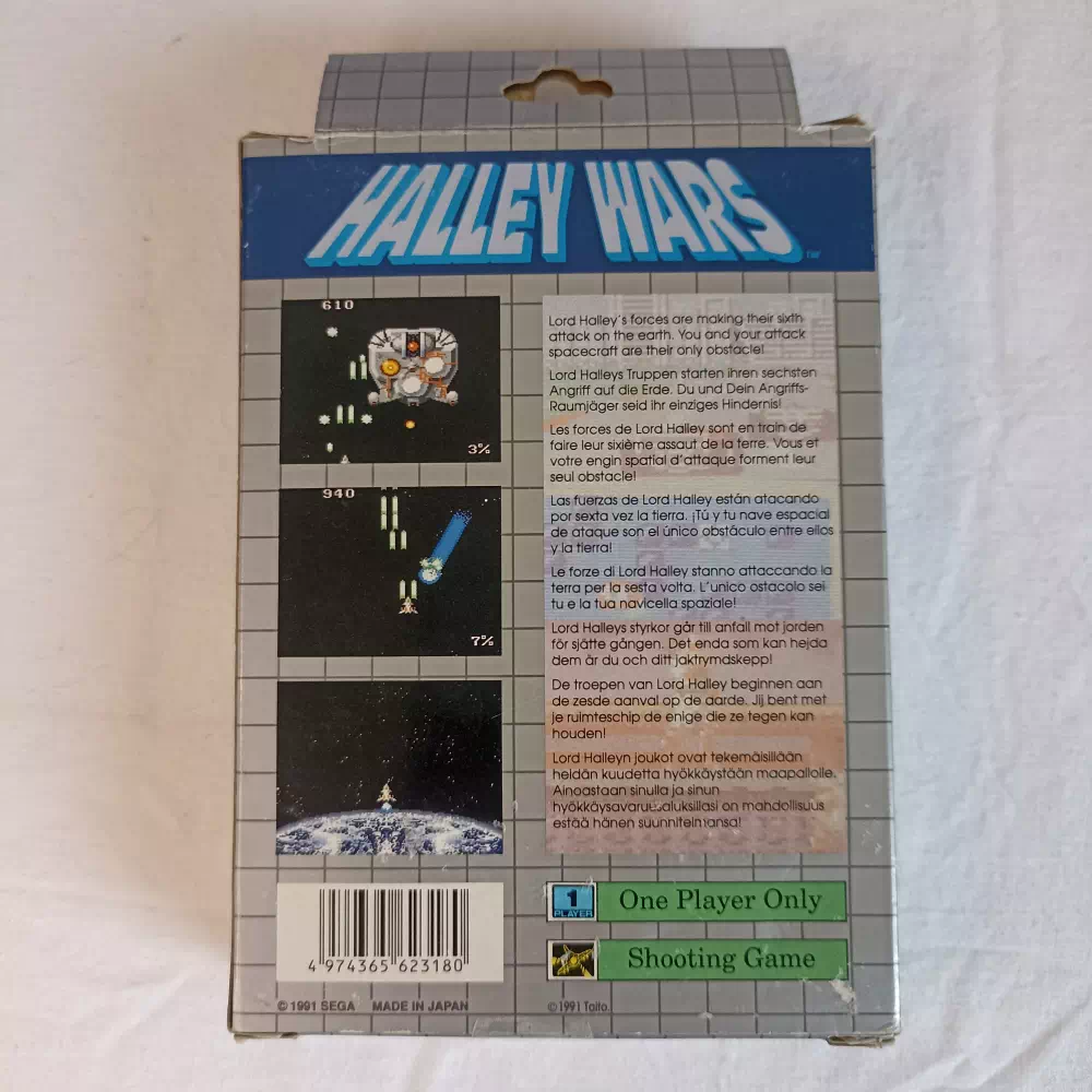 Halley Wars sur Game Gear se situe au milieu du 21ème siècle. Vous pilotez un vaisseau spatial spécialement étudié pour combattre le seigneur Halley et ses armées qui menacent la Terre. Vous devrez éliminer les boss, mais aussi détruire les comètes afin d’éviter toute menace pour la survie de l’humanité.