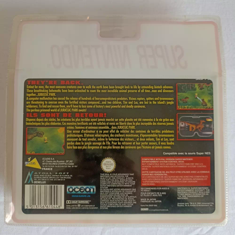 Sous blister rigide, cette édition préserve le jeu dans un état quasi-neuf, parfait pour les collectionneurs passionnés de jeux rétro et de Super Nintendo. Explorez les niveaux emblématiques du parc, évitez les dinosaures carnivores, résolvez des énigmes et vivez une expérience immersive fidèle à l’univers Jurassic Park.