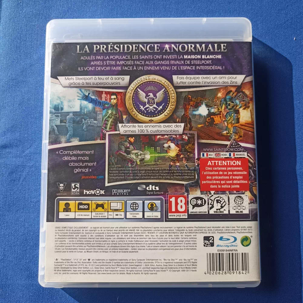 Saints Row IV sur PlayStation 3 est un titre d’action en monde ouvert dans lequel le joueur incarne le président des Etats-Unis d’Amérique face à une invasion extraterrestre. Forcé d’intégrer une simulation de vie, le joueur doit organiser la résistance des humains face aux aliens et ainsi déstabiliser l’ordre établi. Pour ce faire, il peut compter sur le support de son équipe, mais aussi sur des super-pouvoirs et des armes parfois loufoques.