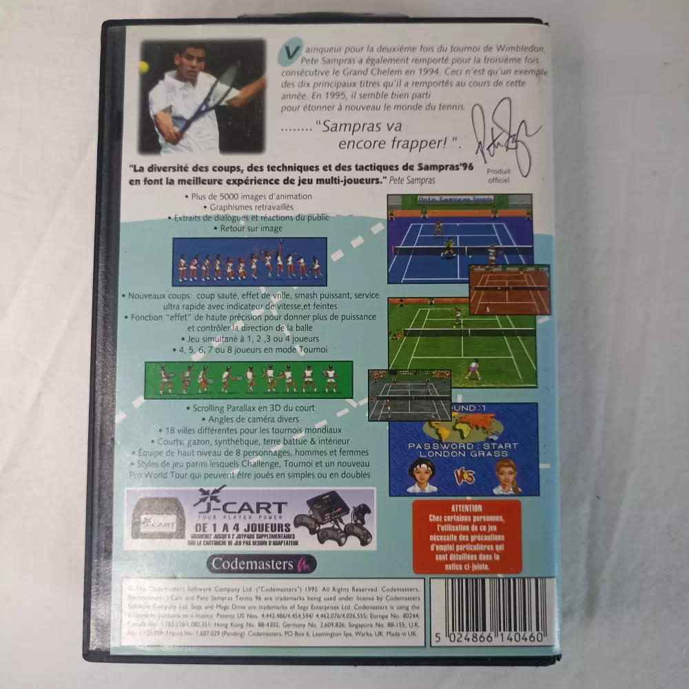 Sampras Tennis 96 est un jeu de tennis sur Megadrive qui vous propose de choisir parmi huit joueurs professionnels dans trois modes de jeu différents : challenge, tournoi et tour du monde. Chaque mode peut se jouer en simple ou en double et quatre types de court sont représentés, allant de la terre battue au terrain en intérieur.