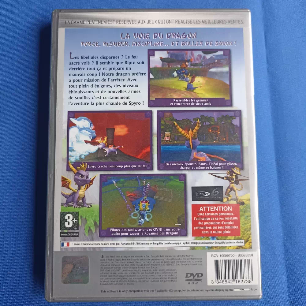 Spyro : Enter the Dragonfly est un jeu de plates-formes sur Playstation 2 dans lequel vous incarner Spyro le dragon. Le jeune dragon va devoir retrouvé les libellules que l’infâme Rypto a capturées. Vous avez aussi l’occasion de piloter des véhicules tels que un char, un avion, un ovni ou une raie manta. Spyro : Enter The Dragonfly est un jeu exclusivement solo.