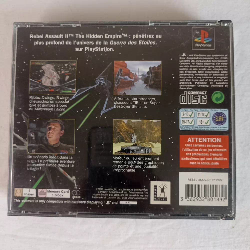 Star Wars : Rebel Assault II : The Hidden Empire est un jeu d’action sur Playstation. Vous êtes une nouvelle recrue dans l’univers de Star Wars. Vous devez commander de nouvelles sortes de navires comme un YT-1300 Corellian Transport, un B-wing, un Y-wing. De plus, vous avez la tâche d’éliminer de nombreux adversaires comme des TIE Intercepteurs.