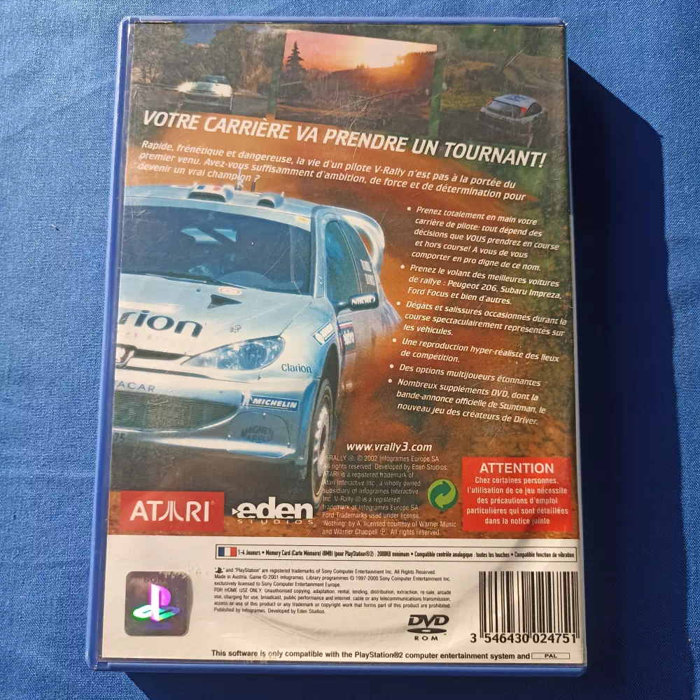 V-Rally 3 est un jeu de courses sur Playstation 2 dans lequel vous embrasserez pleinement la carrière de pilote. Prenez le volant des meilleures voitures de rallye : Peugeot 206, Subaru Impreza, Ford Focus et bien d’autres. Les dégâts et les salissures occasionnés lors de la course par chaque sortie de piste sont visibles sur les voitures. Avez-vous suffisamment d’ambition, de force et de détermination pour devenir un vrai champion ?