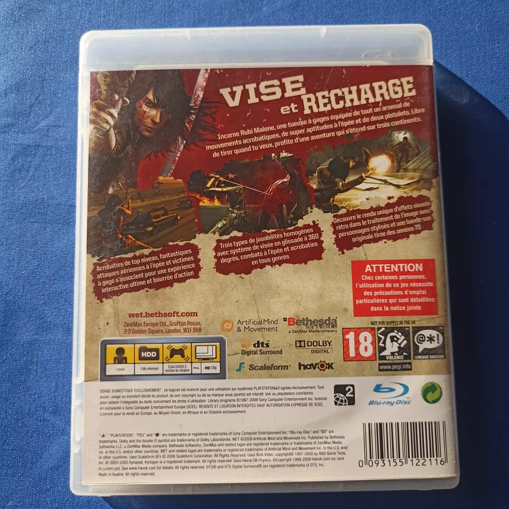WET est un jeu d’action sur Playstation 3. Vous y incarnez Rubi, une tueuse professionnelle maniant aussi bien le sabre que ses deux pistolets et qui se retrouve impliquée dans un scénario digne d’un film de Tarantino. Les références et le style s’en inspirant très fortement ! Prenez part à des gunfights hollywoodiens où il vous faut sauter dans tous les sens en vous agrippant aux objets tout en tirant sur vos ennemis pour marquer un maximum de points.